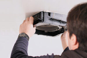 4.新規換気扇の据え付け:最新の省エネモデルを天井開口部へ固定し、電源結線とダクト接続を行います。